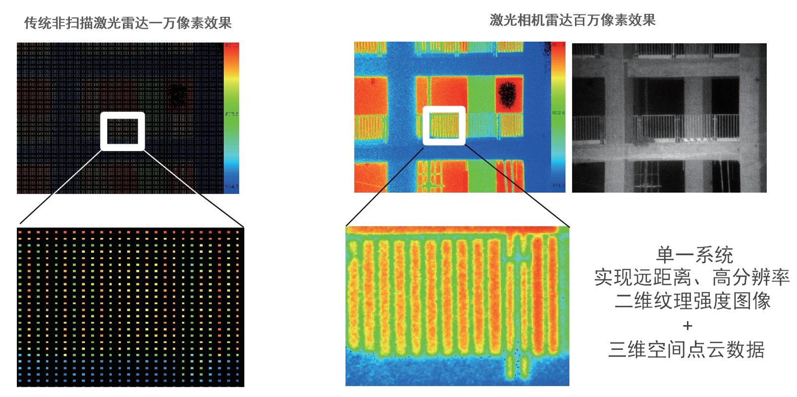 激光門控相機(jī)可實(shí)現(xiàn)單一系統(tǒng)同時(shí)獲得目標(biāo)高分辨率百萬(wàn)像素二維紋理強(qiáng)度圖像和三維空間點(diǎn)云數(shù)據(jù),兼顧并超越傳統(tǒng)激光雷達(dá)和攝像機(jī)復(fù)合效果,點(diǎn)云密度提高1~2個(gè)數(shù)量級(jí),成像距離提高2倍以上。