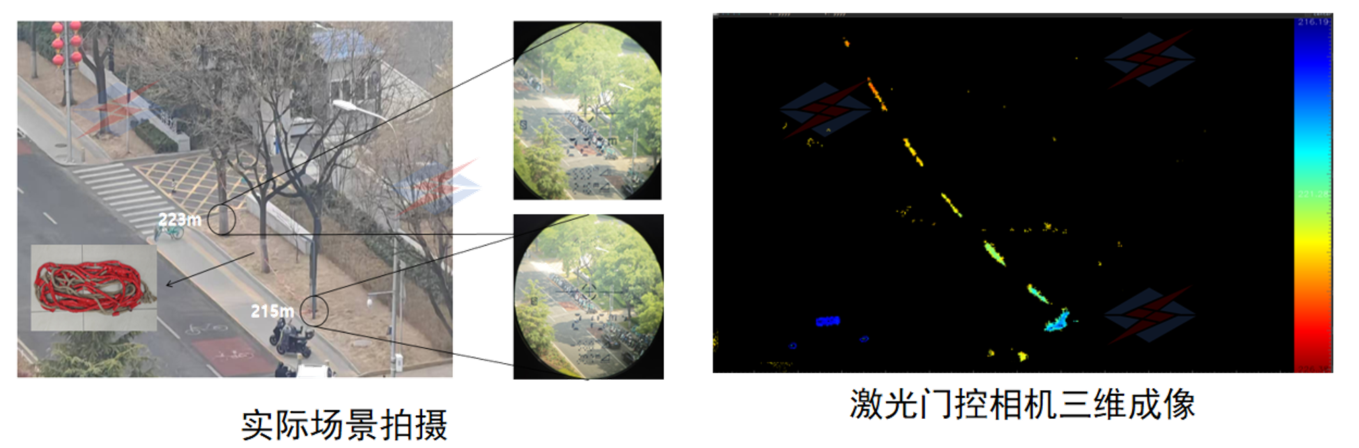 在警用監(jiān)控應(yīng)用場(chǎng)景中,選通夜視可有效避免后向散射干擾,透過薄簾對(duì)簾后強(qiáng)反光物體進(jìn)行成像。另外,選通成像可實(shí)現(xiàn)三維高分辨率成像,達(dá)到凸顯目標(biāo)和了解目標(biāo)空間位置信息的目的。