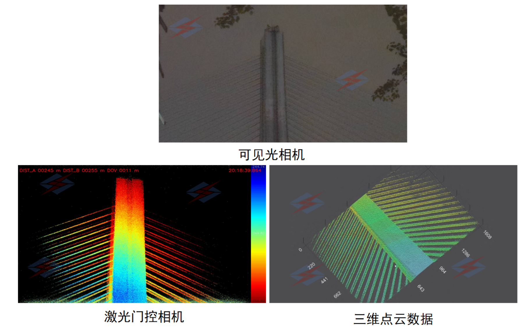 傳統(tǒng)可見光相機(jī)在建筑物監(jiān)測(cè)中常受光線、天氣制約,成像模糊難辨細(xì)節(jié)。而激光門控相機(jī)通過精準(zhǔn)設(shè)定探測(cè)遠(yuǎn)距離區(qū)間(例如245-259米),不僅能輸出高清結(jié)構(gòu)圖像,還可同步生成高精度的三維點(diǎn)云數(shù)據(jù)。在建筑物的細(xì)微沉降、位移、裂縫都可精準(zhǔn)捕捉并量化分析。實(shí)現(xiàn)從“事后檢修”到“事前預(yù)警”的運(yùn)維模式,幫助養(yǎng)護(hù)單位節(jié)省了巡檢成本,顯著提升監(jiān)測(cè)效率。